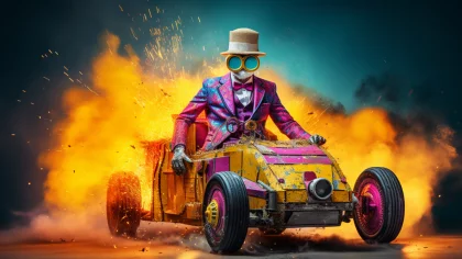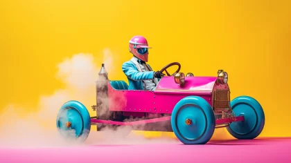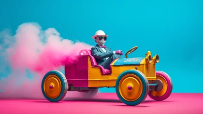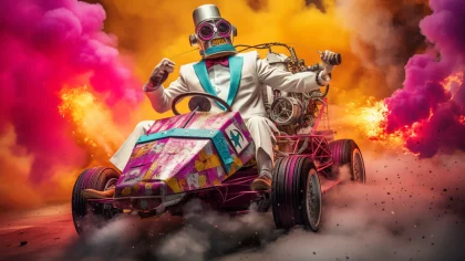 Aus einem Laptop steigt bunter Rauch auf – Symbol für digitale Innovation, kreatives Wachstum und technologische Aufbruchsstimmung